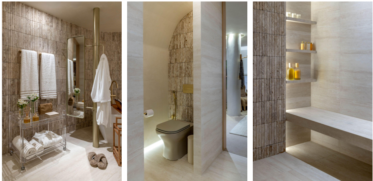 A arquiteta Cristina Côrtes também explora a força dos materiais naturais em seu ambiente. O Anticato Travertino, o Travertino Navona e os mosaicos Fish Scale e Fileto Slat, todos com acabamento envelhecido, valorizam o trabalho manual e a beleza imperfeita das pedras brasileiras.