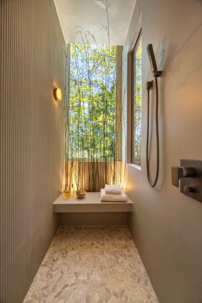 No ambiente de Anna Malta e Andrea Duarte, o piso em Seixo Mezzo Bianco reveste o banheiro com uma textura suave e orgânica. As pedras naturais lixadas revelam a beleza das imperfeições, mantendo o piso nivelado e confortável ao toque.