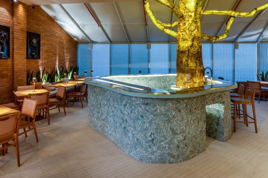 No Descolados Bar, projetado pela Produto Arquitetura, o revestimento aparece novamente. Dessa vez, como escolha para revestir o balcão da ilha central do ambiente, no modelo Seixo Mezzo Verde 30×30.