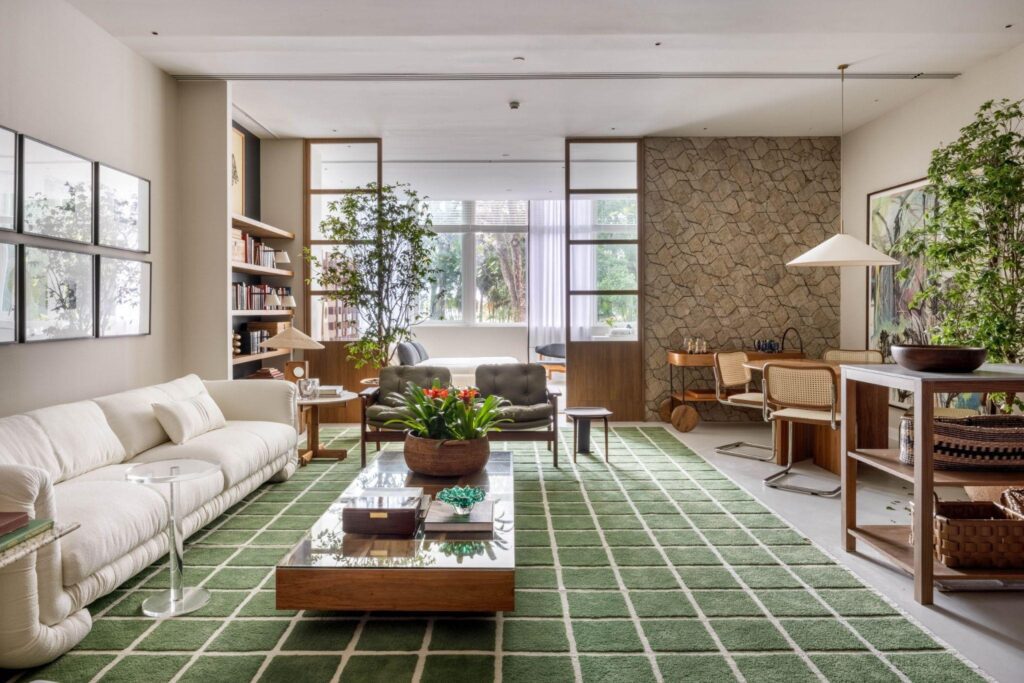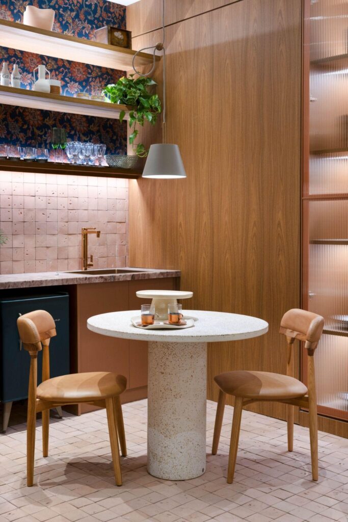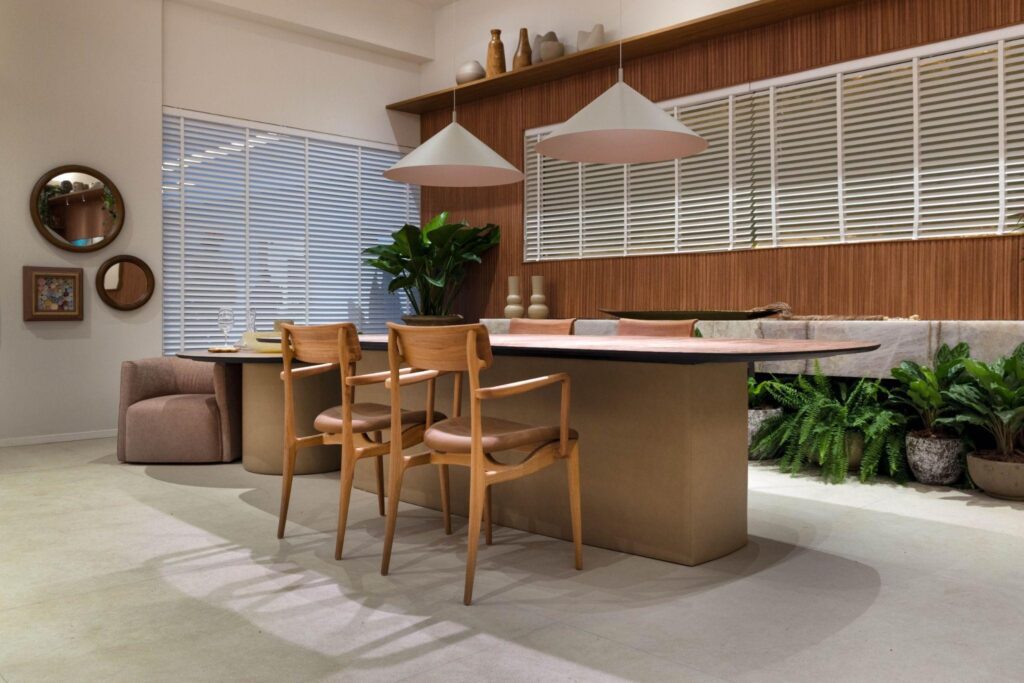 Já no espaço de Jacira Pinheiro, o revestimento Trendwall Moon Beige Cross, produzido artesanalmente a partir de rochas naturais, traz textura, rusticidade e aconchego. Sua instalação em placas cimentícias disfarça os encaixes e reforça a tecnologia nacional aplicada ao design.