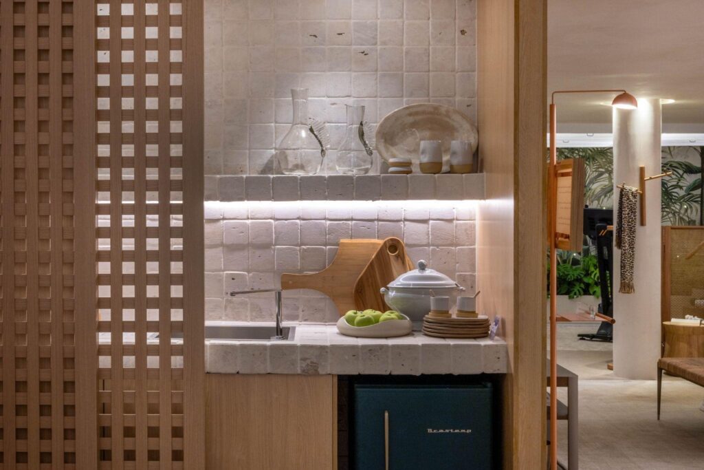 O Cobogó Ondas, exclusivo da Tanto e assinado pela designer Ana Paula Castro, completa a cena: um elemento vazado que homenageia o movimento das águas e a fluidez da natureza tropical.