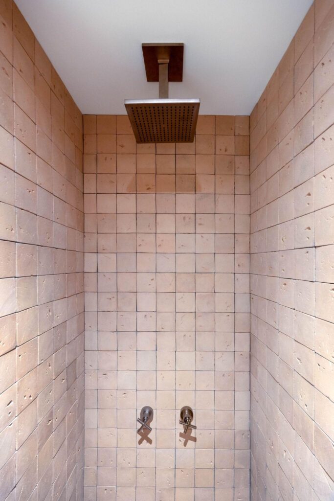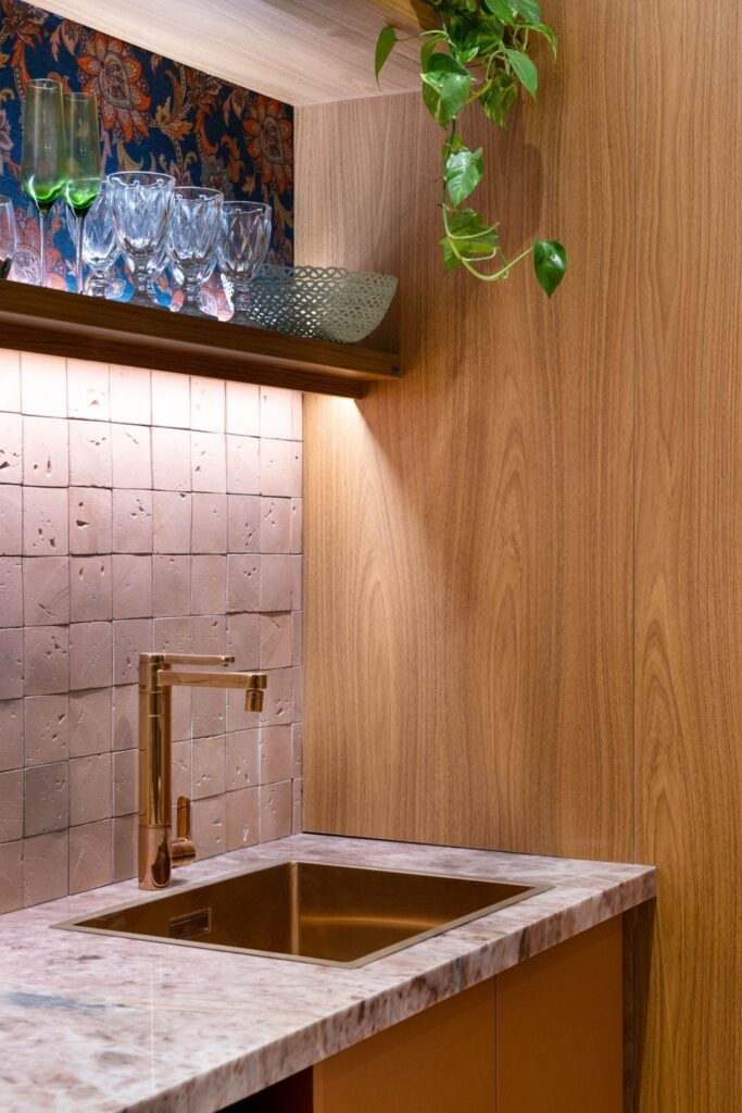 No ambiente assinado por Fernanda Medeiros, o revestimento Quadratto Terracota Rosso (Nina Martinelli), usado na cozinha e banheiro, traz a ancestralidade da cerâmica natural. Um aceno à Toscana, que aparece como inspiração para o loft da arquiteta que projetou um espaço pensado para um casal que ama o Rio e tem raízes italianas. As pequenas peças 9×9, com acabamento envelhecido, trazem a textura do artesanal e o calor da terra — um convite à memória e à origem.