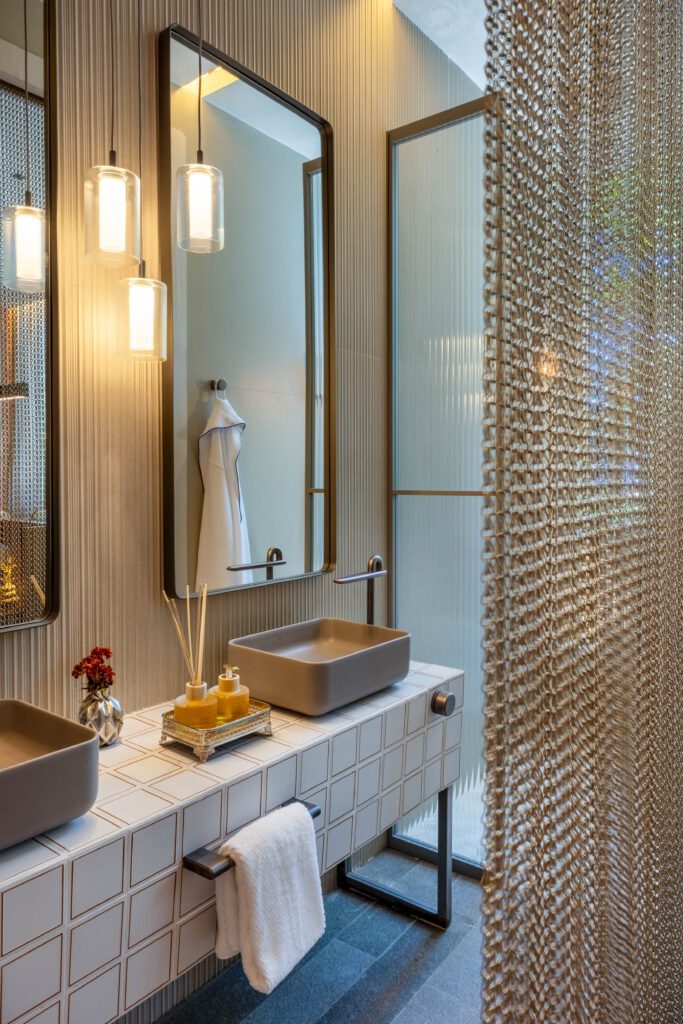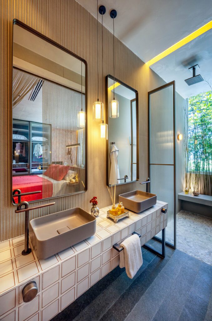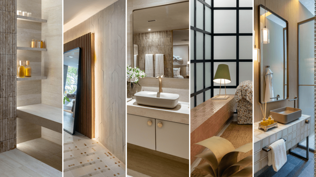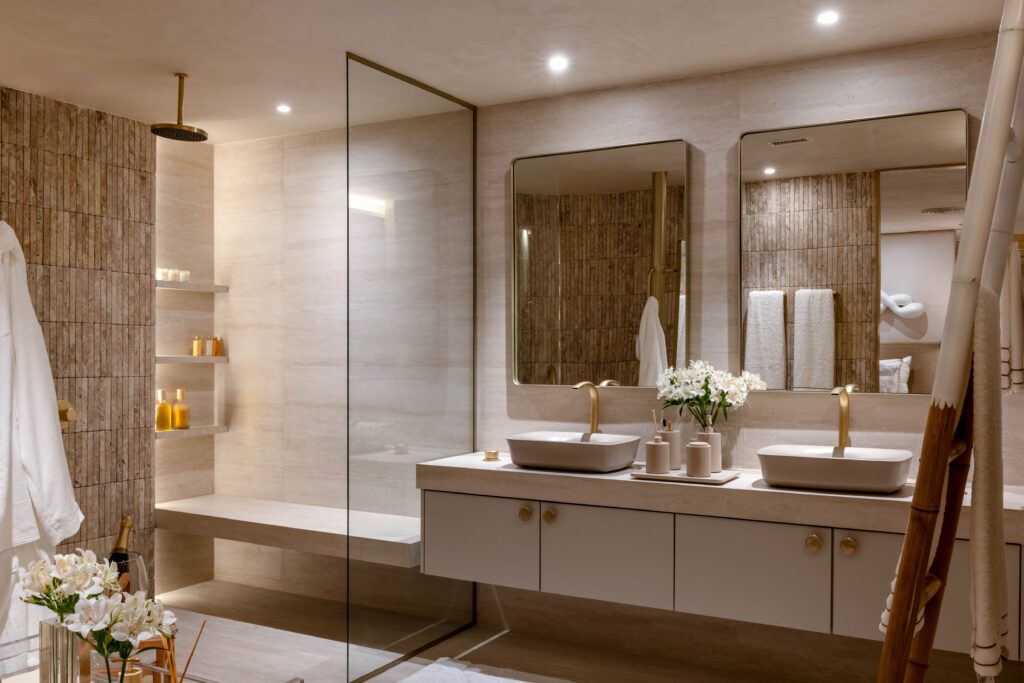 No ambiente de Cristina Côrtes, o banco, prateleiras e bancada do banheiro feitos em porcelanato foram desenvolvidos exclusivamente pela Tanto revestimentos e especialmente para esse espaço. As peças trazem unidade e leveza, reforçando o toque artesanal do projeto.